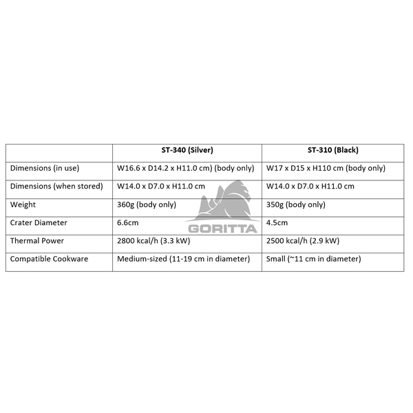 Overall, the Soto ST-340 (Silver) and ST-310 (Black) have some significant differences in their crater diameter, thermal power, and ignition assist lever, which can affect their performance and suitability for different cooking needs. It's important to consider these factors when choosing a camping stove that will best suit your outdoor cooking needs.