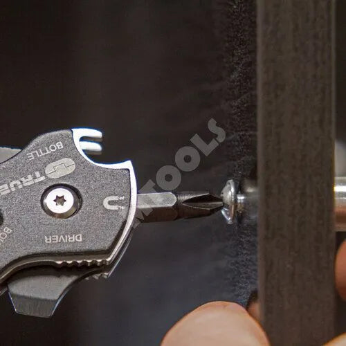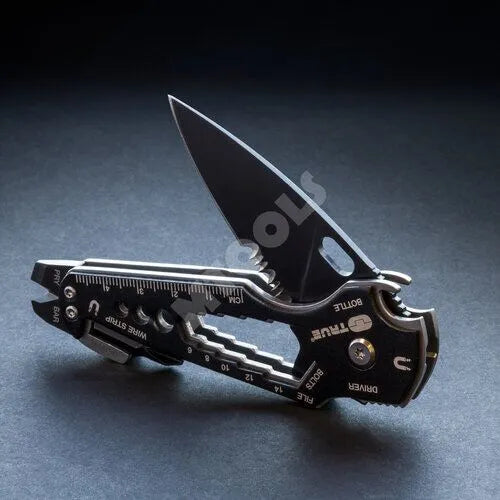 The Smartknife+ is a multitool wrapped around a 6cm partially serrated stainless steel blade. Features include: 3x flat drivers, magnetic 1/4” bit driver, file, wire strippers, rulers, pry bar, wrenches, pocket clip and bottle opener.